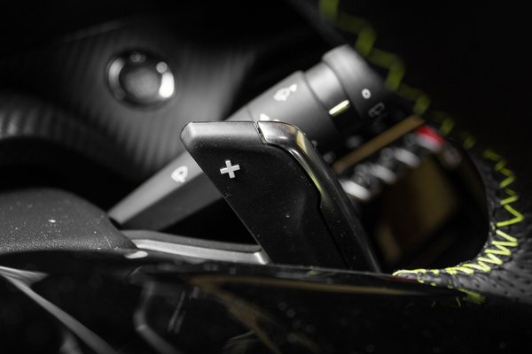 Egy valamit nem tudtam feldolgozni a teszthét alatt, ha már tapizás, az pedig a nemhogy gagyi, de már-már hitvány kormányváltó. Nem mint funkció, mert jól lehet vele mókázni, ha már váltogatnál kicsit a nyolcsebességes automata helyett: anyagában ótvar. Az a fajta üregesnek érződő, pihekönnyű műanyag, ami az ujjhegyeden keresztül szívja le a lelkesedésed. Ha a kisfiam ilyen műanyagból öntött kisautót potyázna boltjáráskor, könyörögnék neki, hogy inkább a drága Bburagót vigyük, mert ez nem autóba való.