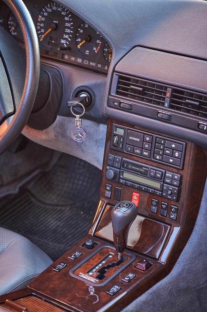 Vezettem már 300 és 500 SL-t, szerettem mindkettőt, ám ez most a nagyvad, a tizenkét hengeres SL 600. A betűk és számok helycseréje nem tévedés, mert 1994-es, ekkor már így jelölte a Mercedes a típust. Az is az évjáratra utal, hogy digitális a kilométer-számláló, viszont még nem jár xenon a nagy motorhoz – ezt az extrát az 1995-ös frissítés vezette be. Amerikai modell ráadásul, és bár a lámpákat E jelűre, a műszereket pedig km/h osztásúra cserélték, az első index megmaradt arra a piacra jellemzően fehér. Szintén megmaradt a gyári autótelefon, amely a könyöklőből kiemelhető kagyló mellett tasztatúráról is kezelhető, kihangosítható. Lenne, de könnyebb a szériában beépített, CD-táras és mélynyomós Bose hifihez Bluetooth kapcsolatot kiépíteni, mint a bizonyára USA-szabványú autótelefont itthoni hálózatra kötni.