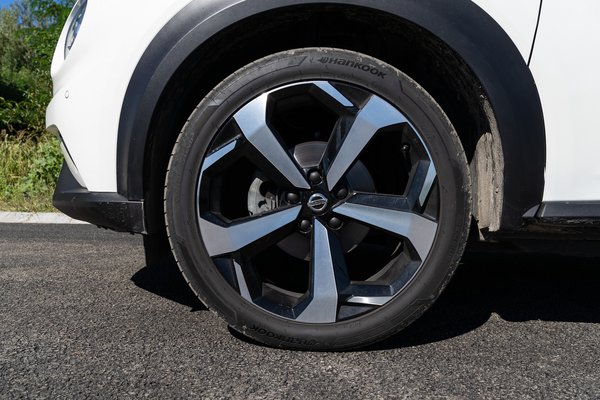 Az óriási kerékjáratba kérhetünk 19-es kerekeket - mármint az N-Connecta, Tekna, N-Design felszereltségekhez, az olcsóbb Red Edition, és Acenta már nem részesülnek ebben - amik messziről kétségtelenül jól mutatnak, és kitöltik a helyet. Közelebbről viszont észre lehet venni, hogy szinte eltűnik bennük az apró féktárcsa, nem mellesleg eléggé pattognak. Pont annyit adtak a Juke-hoz velük, amennyit elvettek.