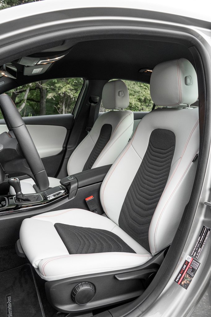 A limuzin nagy előnye a CLA-hoz képest, hogy hátul ugyanolyan kényelmes, mint az ötajtós. Sőt, bennem motoszkál a gyanú, hogy a felnőttnek is komfortos méretű hátsó padot esetleg picit hátrébb építették ebbe, mint abba. A lábhely talán még bőségesebb, és a csomagtartó viszonylag csekély gyarapodását magyarázná, ha így lenne, a gyári adatok közt azonban nem találtam nyomát. Maradjunk hát annyiban, hogy hibátlan négyszemélyes az utastér, két gyerekig családi autónak simán beválik, és barátokkal utazni is tökéletes. Elöl olyan, mint bármelyik A, amivel annyi baj azért van, hogy az alap ülés sajnos itt sem igazán jó, nem találom benne a helyem, és a kárpit továbbra is izzasztó.