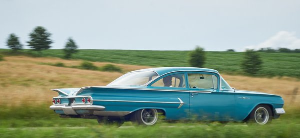 Ez bizony a full size Chevy, konkrétan egy Bel Air. 1960-ban ez a középső felszereltségi szintnek számított az Impala alatt, és kétajtós szedán, nem kupé, annak ugyanis nincs B oszlopa. A 283 köbhüvelykes, azaz 4,6 literes Small Block V8 erősebbik, 230 lóerős változata hajtja, bár ezt akkor még másként mérték, tehát az Erőmérőben kevesebbet villantana. Mindenesetre az 535 centi hosszú, 205 centi széles, hatszemélyes és hozzá 550 literes csomagtartót rejtő karosszériához nem túlzó az ereje. Az alapmotor ebben az évben 3,9 literes sorhatos volt, a csúcsváltozat pedig 5,7 literes Big Block V8, amit akár 335 korabeli lóerővel lehetett rendelni, hozzá gyorsulásra áttételezett négyfokozatú manuálissal.