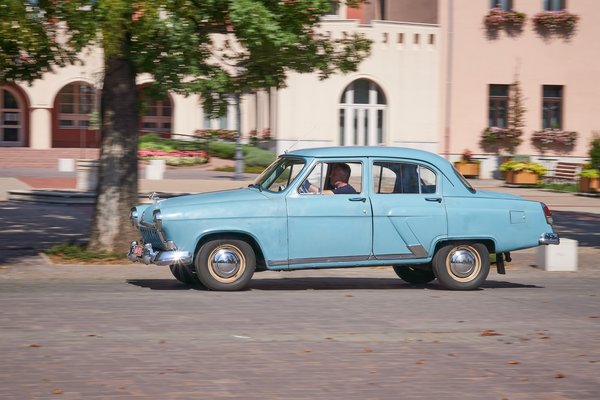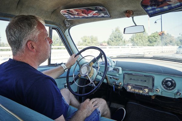 Az alapélmény, hogy elképesztően egyben van az M21, minden kezelőszerv tökéletesen patent. Egyenesen fut, nem kell igazgatni a kormányt sebességnél sem, a kuplung finom, a kormányváltó gépészeti pontosságú, vezeti a kart és csak úgy bepattan a fokozatokba. A gázt minden gond nélkül veszi, nincs torpanás vagy fulladás és a futómű csodásan siklik a napsütésben – igaz, csak 70 km/h-ig merészkedünk. Egészen furcsa élmény, hogy hatvanéves autó, sosem volt felújítva, mégsem kell ügyeskedni a volán mögött, nem szorul, nyöszörög vagy kekeckedik semmi, csak működik. Azért persze az itt is négy dobos féket taposni kell, és bukkanón az is érezhető, hogy a karos-dugattyús lengéscsillapítókat fel kell újítani. De egyértelmű: ez egy igényes, jó minőségű autó.