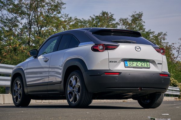 Az első benyomásom, hogy meglepően kicsi. Képeken nagyobbnak tűnik, de testközelből kompakt, keskenyebb és alacsonyabb, mint gondoltam. Ez persze egyáltalán nem baj, sőt teljesen logikus döntés, hiszen alapvetően városi autó az MX-30. Bár elüt a többi Mazdától a formaterv, mégis csinos, szerethető az alakja, különösen a tagolt orra, meg a rakétahajtóművet mintázó hátsó lámpa tetszik. Bár összkerékmeghajtást nem kap, a városi dzsungelben is hasznos lehet, hogy az alsó részét körkörösen koptatós fekete műanyag védi. Kedvesen csalfa a tető íve, mert míg az áramvonal az ajtók körül kupésan lecsapott, a tető egy kicsit tovább kitart vízszintesen, hogy a hátsó utasoknak is jusson fejtér.