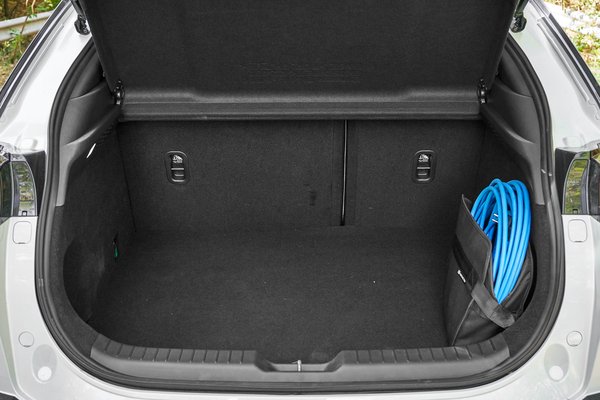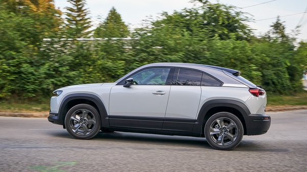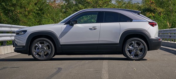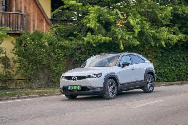 Jól rugózik és csillapít az MX-30, nem ringat és csak üzenetként érezzük az úthibákat. A kanyartulajdonságai is egész jók, stabilan íven marad nagy tempónál, bizalmat gerjeszt, de a hirtelen éles fordulókkal óvatosan kell bánni, ha akár csak kicsit csúszós az út. Kompakt méretei ellenére egyáltalán nem könnyű, és hiába van a súlypont lent középen, ha csökken a gumik tapadása, azonnal elkezd alulkormányozottan viselkedni. 143 lóerős teljesítménye elegendőnek tűnik papíron, de nagy tűzijáték nincs, ahogy a 140 km/h végsebesség és a 9,7 másodperces gyorsulás jelzi. Ez azért is vicces, mert a 136 lóerős Peugeot e2008 simán elveri (8,5 sec, 150 km/h), sőt úgy nagyjából minden gyorsabb az új villanyautók között, a Smart ED és a VW e-Up kivételével.