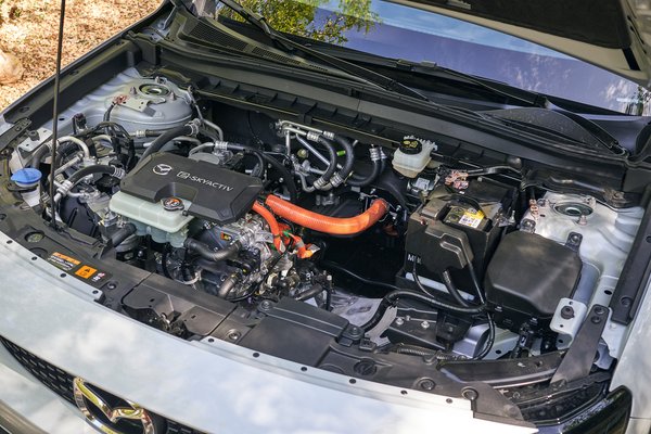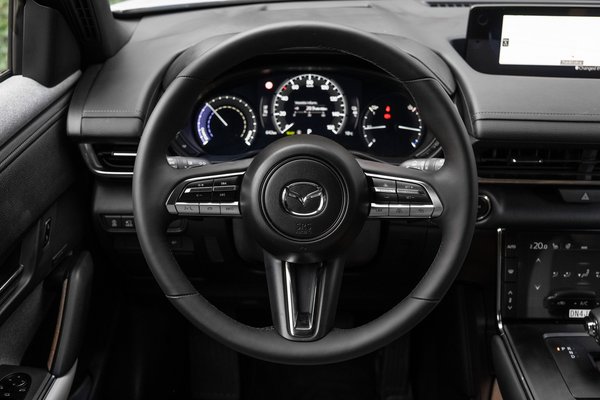 Az óracsoportot az elektromos hajtáshoz alakították, de ennél érdekesebb, hogy a vezetési élmény befolyásolására is hagytak játékteret a sofőrnek, a kormányon elhelyezett fülekkel ugyanis lehet váltani. Persze nem igazából, hiszen fix a redukciós áttétel, ám öt lépcsőben szabályozhatjuk, hogy mennyire legyen erős a motorfék, azaz a gázpedál felengedésével előhívható visszatermelés. Legerősebbre állítva szinte egypedálos az autó, mert ha felengedjük a gázt, viszonylag rövid úton állóra lassítja a kocsit, míg a leglazábbra váltva teljesen megszűnik a visszatermelő motorfék, helyette vitorlázó szabadon futást kapunk. Ez nagyon kényelmes lustán kanyargó országutakon meg autópályákon, és mivel kevésbé kell taposni a pedált a gyorsuláshoz, ilyenkor fickósabbnak érezzük a Mazdát – de ez csak érzéki csalódás, a teljesítmény és az elérhető gyorsulás változatlan mind az öt fokozatban.
