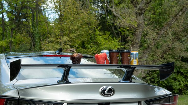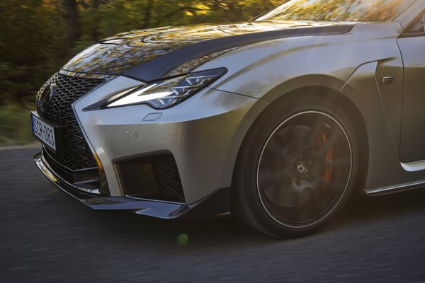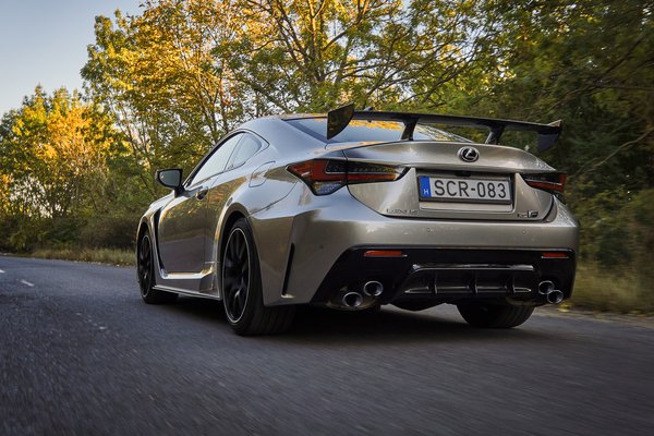 Prémium márka ide, árkülönbség oda, a nagyköbcentis szívó sportmotor összeköt, úgyhogy menthetetlenül a Mustang járt az eszemben az RC-F volánjánál. Akkor meg különösen, amikor kiderült, hiába kisebb valamivel a Lexus, gyakorlatilag ugyanolyan nehéz, felszereltségtől függően nagyjából 1,8 tonna mindkettő. Ráadásul tesztre a Track Editiont kaptuk, ami még így, visszafogott füstarany metálfénnyel is becsapódó meteorként vonzza mindenki tekintetét. Ezzel a csomaggal 38 100 000 Ft a 2+2 üléses sportkupé listaára, cserébe a kovácsolt tízküllős felnik kerámia féktárcsákat rejtenek, vagy hát inkább: tesznek közszemlére. És akkora karbon szárnyat csavaroztak a fenekére, hogy meg lehet uzsonnázni rajta.