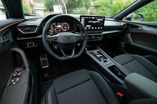 Maga a belső tér a célszerű és ismert VW-konszernes keretek között közepes sikerrel hoz másik ízt az MQB-platformos világba. A világító csíkot, ami körbemegy az ajtókon és a műszerfal felső élén ismerhetjük már más, gazdagabban felszerelt Seatokból, például akár a Leonból, vagy a Tarracóból is, a műszerek és az ő faluk formája sem jelentősen más, de a varrott bőrnek látszó dolgok, a bronzszínű betétek, illetve az egybe fejtámlás, már-már kagylóülésnek látszó, de minimum gémerszékeknek mondható ülések annyira elviszik a szemet, hogy tagadhatatlanul van némi újszerűség itt. A kormány azonban mekkora blaszfémia – a bal küllő alatt levő, kör alakú autókarakter-váltó nyomógomb (rajta a Cupra-logóval), illetve a másik oldalon levő indítógomb miatt tiszta Ferrari 458 Italia vagy Alfa Giulia QV. Bár, ha belegondolok, kicsit talán még jobban is néz ki azokénál, de akkor is koppintás.
