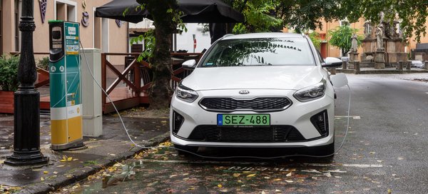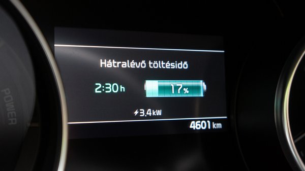 Első útra pont egy harmadrészt város kétharmadrészt autóút kombót csináltam tisztán villany módban. A teletöltött autó 53 kilométernyi hatótávot írt ki, végül 45 kilométer után merült le az akkumulátor. Azt nézve, hogy városból indultam, és hogy az M2-esen 110-zel menve végig 80-90%-os teljesítményen ment a 80 lóerős villanymotor, szerintem elég tisztességesen becsült a számítógép. Tölteni Type 2-es csatlakozóval lehet a köztéri állomásokról, de nagy csodára nem érdemes számítani. Hiába csak 8,9 kWh-s az akkucsomag, maximum 3,3 kW-tal tud tölteni az autó (csak 1 fázison), DC töltést nem tud a plug-in Ceed. Így több mint két óra kell neki nulláról a 100%-ra töltéshez.