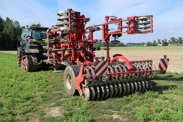 A különleges gépet több országon átvezető bemutatóútján kaptam el egy fordulóra, Kisbajcs határában. Kőkeményre száradt lucernaföldön húzott egy négy méter munkaszélességű, 30 centis mélységre állított Horsch Tiger 4 MT grubert (tárcsákkal és kapákkal ellátott művelőeszközt), 10-11 km/órával, erőlködés nélkül brummogó motorral. Hozzáteszem, hogy ha bármilyen járművet biztosan le kellene horgonyoznom, egy ilyen grubert választanék, ez meg csak úgy robog vele. Munkahelyzetbe leereszteni és a sor végén kiemelni egyetlen gombnyomással kell. A kormányzás pontosan olyan érzést ad, mint a kerekes típustestvéré, a fülkében szinte észre se venni, hogy járószerkezetes modellt vezetek. Tényleg nagyon simán megy. Menetpróbám után megnéztem a nyomainkat, a lucerna már kezdett felegyenesedni, tényleg nem tapostuk szét. Műkedvelőként nagyon élveztem a hatalmas gép kipróbálását, de az volt a benyomásom, hogy egész napot is szívesen végigdolgoznék vele. Jó lett volna estig maradni, hogy lássam a sok-sok fényszóróból áradó világítást.