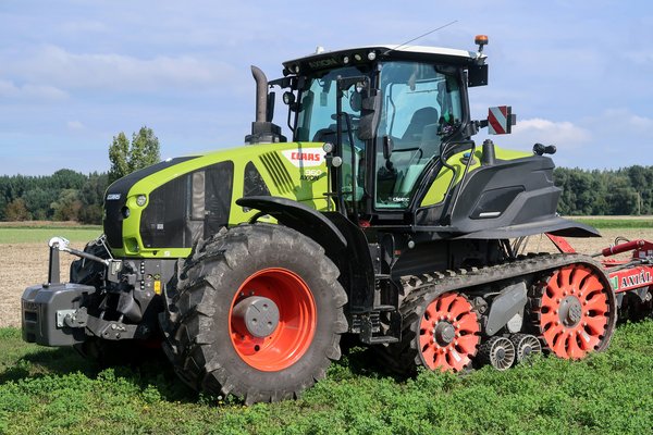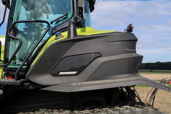 Impozáns masina. Három méter széles, ennél is nagyobb magasságba tornyosul fölénk, közel húsz tonnás, de az első függesztésen a súlyeloszlás javítására még visz egy kilencszáz kilós acéltömböt, és a vontatott munkaeszköz is terheli, úgyhogy összesen 22 tonnára hat a gravitáció. Motorjának 450 lóerejét folyamatosan változó áttételű CMATIC erőátvitel továbbítja. Legérdekesebb része mégis az előre tíz, hátrafelé hat foknyit billenni képes, rugózott járószerkezet, amely négyféle (18, 25, 29 és 35) colos hevederszélességgel választható. Rugóútja nem is olyan kicsi, 120 milliméter, ez már jól kisimítja a talajegyenetlenségeket.