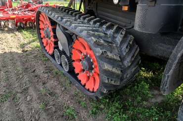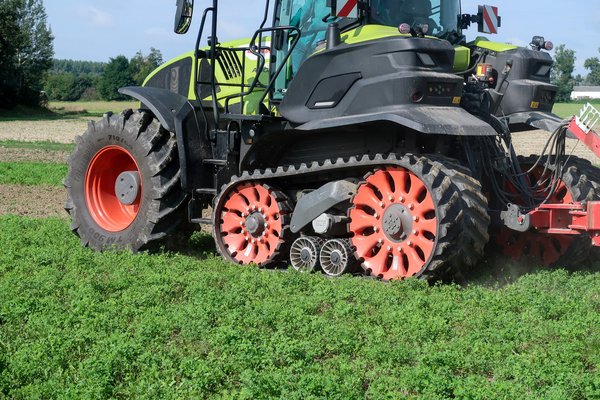 A traktorkerék ráadásul kevesebbet halad, mint amennyit a kerülete forog, van egy kis csúszása (szlip), ami gázolajpazarlás árán kínozza a földet. Ezért kezdtek a legnagyobb kategóriákban áttérni az acél lánctalphoz hasonlító gumihevederre. Nagy felületen oszlik el a súly, nem „omlik be alatta sírva a föld”, és rugalmas anyagával kíméli az aszfaltozott utakat, amikor a földekre vonul – akár 40 km/órával lehet robogni vele.