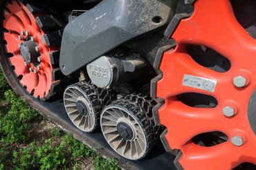 Oké, eddig érthető, láttunk már ilyen erőgépet a Totalcaron is, de mi értelme gumikerekekkel kiegészíteni? Annyi, hogy forduláskor keresztirányban csúsznak a gumihevederek, hiszen ez a kormányzás egyetlen lehetséges módja, s nagy motorteljesítmény és fogyasztás árán nyírják a talajt, ami megint csak nem tesz jót a növényeknek, sem a szántóföld szerkezetének. A két első kerék viszont ugyanúgy kormányoz, mint bármelyik traktoron, a gumihevederek meg kisebb nyírással követik őket.