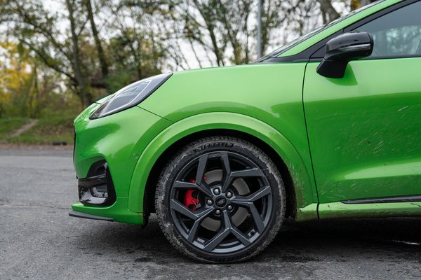 A piros ST jelzéseken túl még elég karakteresek a tizenkilences könnyűfémfelnik, amiknek a mintája inkább elegáns, mint vagány, de ez nem változtat azon, hogy jól néz ki. Rajtuk Michelin Pilot Sport 4S gumik vannak, amit a Ford konkrétan a Pumára csinált a Michelinnel.