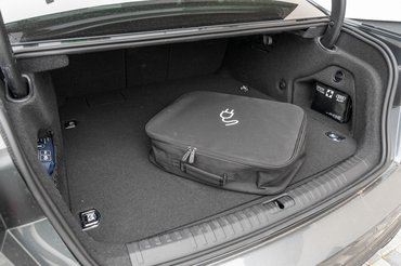 A 2,92 méteres tengelytáv miatt a hátsó sorban is bőven el lehet férni, hosszabb családi utazásokra viszont nem feltétlen alkalmas az autó, mivel nincs hely a bőröndöknek a csomagtérbe szerelt bruttó 14,1 kWh kapacitású Li-Ion akku miatt. Ezzel 170 liternyi pakolható terület tűnt el, 360 maradt, de ennek teljes kihasználása is igen nehézkes, ugyanis baromi mély a csomagtartó. Tovább rontja a helyzetet, hogy a töltőkábeleknek sincs külön zseb vagy tároló, csak egy táskába vannak betéve, ami szintén helyet foglal.