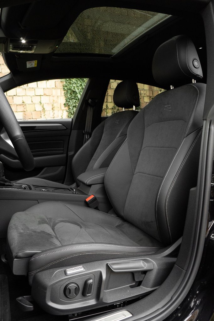 Van azonban előnye is ennek az architektúrának. A kompakt kocsikra méretezett, helytakarékos megoldások és a nagy alapterület együtteséből ugyanis az jön ki, hogy az Arteon belseje óriási. A csomagtér 563 liter, és mivel nagy ötödik ajtón át pakolhatunk, ezt ki is lehet használni. És mindez nem megy az utasok rovására, a hátsó sorban akkora a tér, hogy sofőrös hintónak is elmenne, négy emberrel a fedélzeten elképesztő terpeszkedést lehet bemutatni. Szinte vicces, mennyire tágas hosszában és széltében az utastér, a vezető körül is nagy hely van, csak a plafon került kupésan alacsonyra, pláne így, napfénytetővel. Aki a padlóra engedi az ülést, annak ez nem gond, de én szeretem magasra húzni, így hiába nem vagyok egy colos gyerek, a hajam már szinte a kárpitot súrolta.