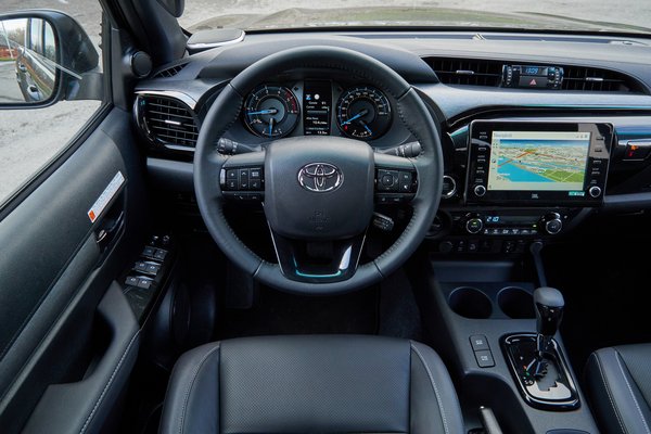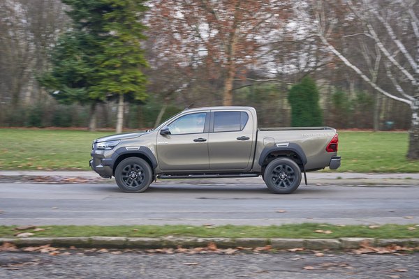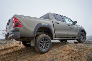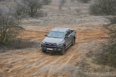 Viszont a kapaszkodóképessége egészen megdöbbentő. A tesztautón terep téligumik voltak, és ezzel, meg a jelentős kitérésre képes hátsó híddal könnyedén fogást talál négykerék-hajtás nélkül is, ha pedig igazán durva lenne a helyzet, a hátsó difi zárható. Próbáltam, és azzal meg a felezővel kényelmesen felkúszott olyan süppedős-homokos emelkedőn, ahol korábban az utcai gumis Defenderrel nekifutás kellett – igaz közben fagyott, amitől tömörebb a talaj. Épített off-road pályákkal, vagy mély dzsungellel ki lehetne fogni a Hiluxon, de strapára meg teherszállításra abszolúte hibátlan, és a terhét simán elviszi traktor szabdalta földúton vagy akár szántón át, semmi gond.