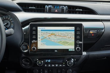 Kár, hogy sosem sikerült igazán kényelmesen elhelyezkedni a vezetőülésben, például a kormányt nem tudtam elég közel húzni, mert az erős motorral és jó váltóval tulajdonképpen kellemes utazóautó lenne a csúcs Hilux. Feltétlenül szükséges azonban egy zárható doboz a platóra, vagy akár a teljes raktér zárhatóvá alakítása, mert így minden kacat az utastérbe kerül, és messze nem áll olyan jól rekeszekkel, hogy ezt kényelmetlenség nélkül megúszhassuk. Alapból fényezett platóval adják, ez azt jelenti, hogy ha családi kocsinak szánjuk, kötelező pár kiegészítővel felszerelni. Viccesen hat, hogy a JBL hifi hangszóróját mintha csak odahenkölték volna a műszerfal tetejére, de a látvány ellenére meglepően kellemesen szól.