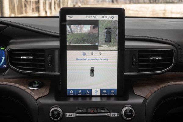 De a fentieket mind megszoktam pár nap alatt, mert az Explorer vezetése koherensen tespedős-nyugodt élmény, és családi kocsiban hajlok a békés autózásra. Ennél számomra zavaróbb tervezési baki, hogy elirigyelték a Teslától az álló tablet ötletét. A gyári navigációt még sikerült felprogramozni úgy, hogy kitöltse a teljes képernyőt, de ha Android Auto segítségével feldugom a telefont, az már fekvő képpel jelenik meg a kijelző felső egyharmadán. Igen, a Maps is. Sőt, ugyanott látható a tolatókamera képe, de ráadásul úgy, hogy mellé szerkesztették a felülnézeti 360°-os képet is, nem alá, tehát egészen kicsi mindkettő – amatőr programozási hiba, melynek eredményeként a behemót SUV parkolása csak tökéletes látással kivitelezhető, annyira piciny a kép hozzá.