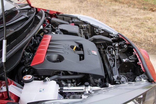 A motor maga teljes egészében könnyűfém-ötvözet, nagyon vékony acél hengerperselyekkel. Közvetlen- és szívócső-befecskendezése is van, ami egyrészt gátolja a kokszosodást, hűti a szívószelepeket, másrészt jót tesz a rugalmasságnak, és a versenysportból ismert golyóscsapágyas turbó sem maradhatott ki. Érdemes pofán nézni az autót, büszkén hordja elöl a hatalmas intercoolerét. Lent sem fuldoklik, de különösen 4000-től 7000-ig megy vérlázítóan, és nem sokkal a tiltás előtt jön a jellegzetes szívó süvítés, ami tényleg elveszi a vezetőtől a józanság utolsó morzsáit is.