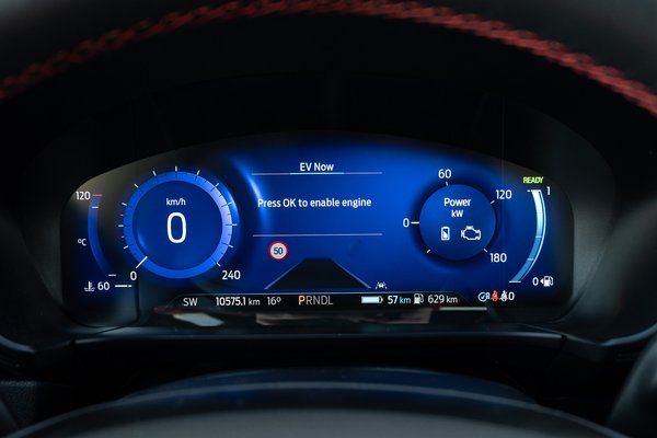 A Ford multimédiás világa megér pár szót, mi tagadás. A már említett képernyős műszeregység nem aknázza ki a benne rejlő lehetőségeket, nem is túlzottan konfigurálható, de az átlagembernek elég. Az jó ötlet, hogy az információs területen lapozható témák vannak, ilyen fogyasztás, olyan fogyasztás, elektromos energiafelhasználás, és ha nem akarod, hogy állandóan számok ugráljanak ott, van egy Calm Screen is. Viszont a cirka 15 tételből csak hét válogatható be ide, egy menüből, miért? Miért nem lehet nyolc? Az balszerencsét hoz a sziú babonák szerint?