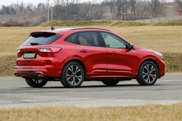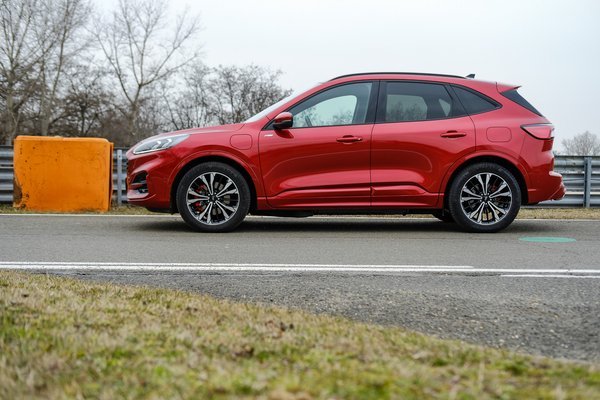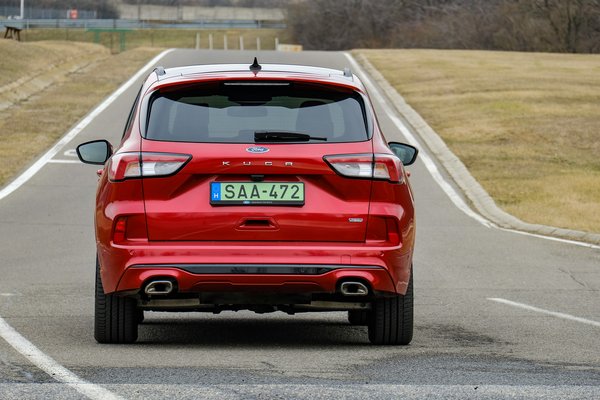A Kuga esetében még egy dolgot nem árt tudni: ez egy SUV, de a tölthető hibridrendszer miatt kapott egy csomó kramancot a hasa alá, és ezek miatt a szabad magassága semmivel sem nagyobb, mint egy Opel Corsáé. Ha tehát nagyon elkapná az embert a terepezhetnék, mivel nincs mindenhol páncél, kárt lehet tenni benne bakhátas utakon, vagy akár a járdaszegélyeken. Nálunk az őszinte verzió járt fronthajtással, nincs is vele semmi gond, de összkerékkel sem szabad csodát várni tőle. Egy apró érdekesség: a Fordnál egy sima kardánnal oldják meg a hátsó hajtást, nem egy extra villanymotorral, mint a Toyota RAV4 esetében. Mivel ez olyan késedelemmel reagál, hogy elég sután viselkedik, látatlanban úgy gondolom, hogy a Ford megoldása ügyesebb lehet. Persze ezzel együtt is inkább havas, csúszós útra ideális az összkerekes Kuga PHEV.