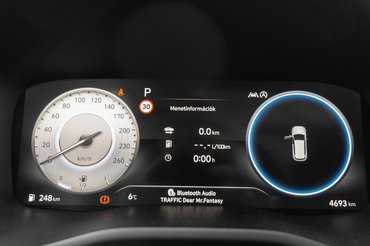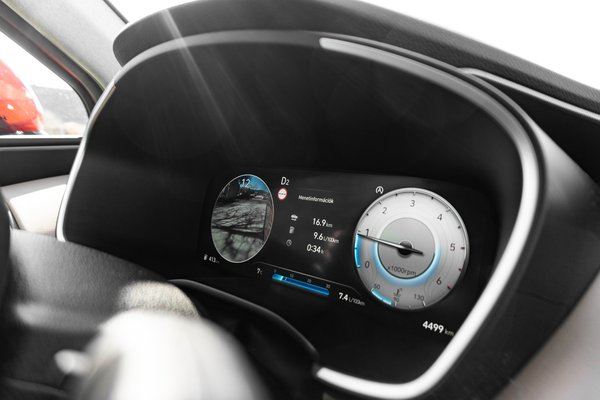 Pedig összességében nincs odabent nagy világmegváltás, csak egyszerűen nem drága, de igényes anyagokból felépítettek, egy nem drága, de igényes belteret. Ugyanezt láthattuk a Tucsonban is, itt talán egy fokkal kevésbé extrém bútorzat, cserébe még egy fokkal jobb az ergonómiája. A kedvenc részletem továbbra is a fordulatszámmérő vagy sebességmérő megjelenő holttérfigyelő, ami sávváltásnál pont azt a kritikus pár négyzetmétert figyeli a tükör alatti kamerával, ami a baleseteket okozza. Kitesszük az indexet, és amíg megy, addig látjuk, ki van a holtterünkben, ezt egyszerűen kötelezővé tenném.