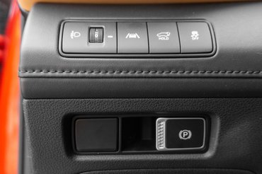 Aminek viszont nem lett volna szabad gombosodnia, az a váltó előválasztó. Láttunk már kart, pöcköt, tárcsát, gombokat is, de egész egyszerűen az irányváltásnak több visszajelzésre lenne szüksége, mint egy gomb lenyomása. Még a Porsche alig gyufásdoboznyi előválasztója is lényegesen jobb megoldás, és nem kevésbé letisztult, mint pár nyomógomb. Ettől eltekintve még egy ponton lehet belekötni a beltérbe, legalábbis nekem zavaró, hogy bal térdhez, a kormány alá került a kézifék gombja. Tök jó helye lett volna középen.