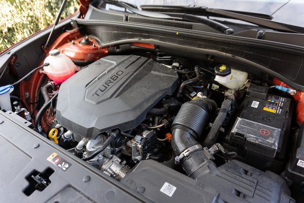 Ebben a változatban a prémiumság a motortérben ér véget, hiszen ez egy mezei 2,2 literes turbódízel, 202 lóerővel és 440 newtonméterrel. Nem túl vérpezsdítő motor, de ha onnan nézzük, a már emlegetett Audi Q5 kétliteres TDI-je pont ennyire volt lelkes, csak azt hosszában építették be. Vicces, hogy a Hyundai géptetejét felpattintva ebben is egy olyan motorburkolat van, ami hosszmotorra utal, pedig...
