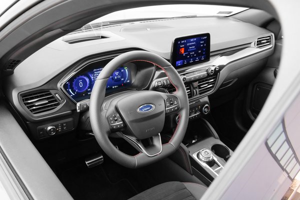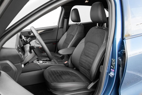 Akadnak benne remek ötletek, mint a kis spricnivel tisztán tartott tolatókamerák, az ajtó nyitásakor kiugró élvédők vagy a kupak nélküli üzemanyagbetöltő nyílás. A csomagtartót fedő puha és könnyen deformálódó anyagot is annak szánták, de a zsinórokon lógó lebernyeg nem igazán minőségi látvány. Ugyanígy tízmillió felett már fájó a végtelenül sivatagos műanyag ajtókárpit, jelzésértékű bőrrel megijesztve könyök alatt, meg az irgalmatlan kemény középkonzol. Mindennek a tetején ott trónol a kéken virító központi érintőkijelző, ami tudja a feladatát, de érezhetően előrébb jár már az ipar a Ford kicsit lassú, eleve ódivatúnak kinéző rendszerénél (erről részletes keretes van Papp Tibi plug-in tesztjében). Az mindenképp szerencsés, hogy a klímának és a hangerő állításnak vannak fizikai kapcsolói.