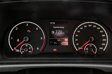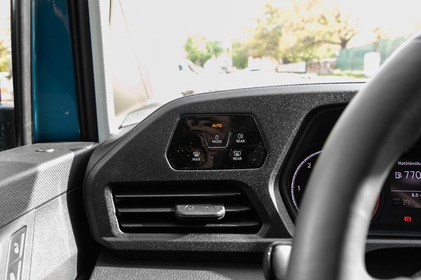 Pedig a tesztautó nem a legdrágább felszereltséget kapta, de még csak nem is a Maxi California, hogy esetleg a műértő van-life fanok torzuljanak rá, hanem épp a mezítlábas, polgári verzió: acélfelnik és dísztárcsák, a full digitális, testreszabható MIB3 kijelző helyett hagyományos, fizikai mutatós műszeregység középen LCD-téglalappal. Abszolút pozitív, hogy a VIII-as Golfhoz hasonlóan a fényszórók kezelő-felülete a bal térdtől két emelettel feljebb került, így már nem kell érte vakon matatni a sötétben.