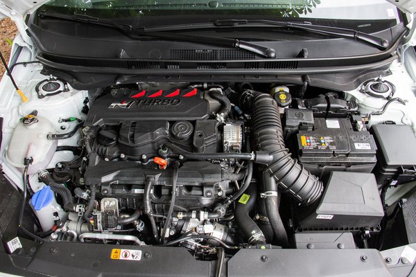 Mindez meg is látszik rajta! A négyhengeres, 1,6 literes, 204 lóerős turbómotor lehetne talán egy picit élénkebb, de így is úgy húz a gázpedál minden határozottabb lenyomására, mintha valaki hátulról rugdosná az autót. A 275 Nm-es legnagyobb nyomaték papíron már 1750/perces fordulatnál megérkezik, de ellenállhatatlannak tűnő erővel inkább csak 3500-tól robbant, de onnan nagyon megy, egészen 6000-ig. Utána elpörög még egy ezrest, ha hagyjuk neki, de az erő ott már nem nő tovább. Persze, ahogyan a kipufogóhang, úgy a gázreakció is állítható. Részben változik az üzemmóddal együtt, ami lehet Eco, Normal, és Sport, valamint a kormányon lévő kék gombokkal közvetlenül kapcsolható két darab N jelű mód. Ezen kívül a második, egyénre szabható N Custom módban külön-külön is állítható több minden, méghozzá három-három fokozatban.