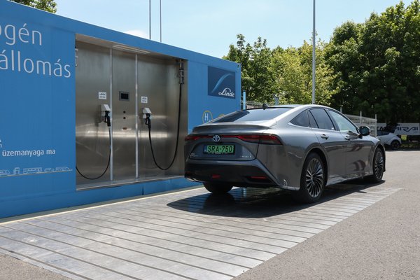 Utóbbi, tehát a nagyobb nyomású, már a töltőpisztolyba épített infrán kommunikál az autóval, amelynek töltöttsége és minden releváns adata meg is jelenik a töltő képernyőjén, rajta fő helyen a hidrogén ára kilóra pörög, nem literre - nyersanyagpiac ez kicsiben. Az állomás még tesztüzemben működik, a töltőnyomás is a névleges 700 bar felére van állítva, emellett minden töltésnél jelen kell lennie egy lindés szakembernek, az adatokat pedig céges szinten meg is osztja egymással a szolgáltató és a Toyota, a tanulófázis tehát még javában tart.
