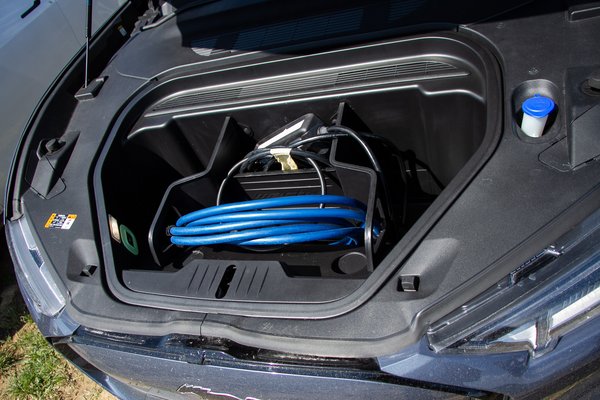 A hátsó csomagtartó 402 liter, ami szerény, de nem szégyenletes, és lábbal elkaszálva alatta magától kinyílik. És van elöl még egy 100 literes, rekeszekre osztott, a jégkockás italszállítás kedvéért vízkifolyóval szerelt első csomi.