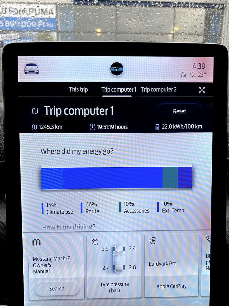 Nagy hidegben a fűtés beleharaphat a hatótávba, de biztos úgy voltak vele a Fordnál, hogy ekkora akksi mellett nem kell a hőszivattyú - a legnagyobb Teslákba szintén csak mostanában jött meg (a kisebbekbe régebben). Amikor először beleültünk, az élettapasztalata alapján a komputere 22 kWh-s átlagfogyasztást és 450 km hatótávot saccolt a 100%-os akksiból, az teljesen hihető normális használathoz.