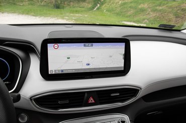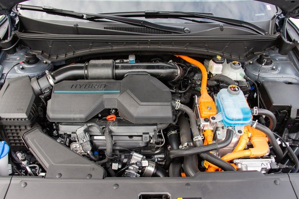 Feliratát leszámítva a hibrid nem nagyon hirdeti, hogy mi is ő valójában. Ehhez fel kell nyitni a gépháztetőt, ami alatt a sárga kábelek elárulják, hogy ott nagyfeszültségű áramok áramlanak vagy az 1,49 kWh-s lítiumpolimer akkumulátorból a 44,2 kW-os elektromotor felé, vagy vissza. A hibrid rendszer belső égésű motorja a Tucson plug-injához hasonlóan az 1,6 literes, 180 lóerős, turbófeltöltős benzinmotor. A két motor együttes teljesítménye 230 LE, nyomatéka 350 Nm, ezzel a Santa fe legnagyobb sebessége187 km/h, WLTP szerinti fogyasztása 7,6 l/100 km.