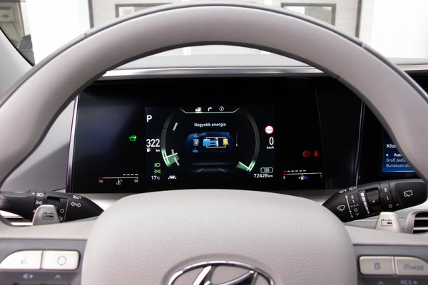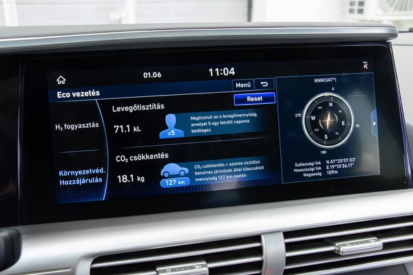 Amúgy épp ilyen átlagot mutatott a fogyasztásmérő, amikor beültem. Talán mondani sem kell, hogy a Nexo digitális műszeregységén is figyelemmel kísérhető az átlag és a pillanatnyi fogyasztás is. Az vicces csak az, hogy az utóbbin a legnagyobb szám nem 20, 30, vagy még több liter/100 km, mint egy belső égésű motoros autókén, hanem 6 kg/100 km. Intenzív gyorsításokkal kiakasztható, talán ez is volt az oka, hogy én úgy szálltam ki a Nexóból, hogy 1,2 kg/100 km-es átlagot hagytam magam mögött. Ám még ezzel is több, mint 500 kilométer lenne az egy tankkal megtehető távolság! Menet közben a legalacsonyabb érték, amit elértem, kereken 1 kg/100 km volt 90 km/órás sebességnél. Autópályán, a megengedett százharmincas tempónál másfél kilogrammos fogyasztást mutatott a mérce, vagyis 400 kilométert még így is meg lehetne tenni egy tankkal. És mindezt káros anyag kibocsátás mentesen.