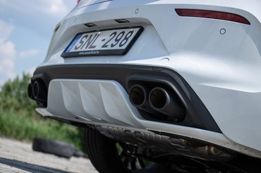 Klasszul útra feszülő kiállása van a 19 colos felnik (360 ezer) és az elöl 25, hátul 20 milliméteres ültetés miatt. Futóműve hátul multilink, elöl pedig MacPherson és őrületesen jól hangolták. Pont annyi feszesség van benne, amivel már könnyű magabiztosan beereszteni vállalhatatlan tempóval a kanyarba, de az esztergomi töredezett aszfalton vagy a bazaltkockás úton sem ráz kellemetlenül. Nagyon szépen rátámaszt az íven, és érezni, mikor könnyül el picit a feneke. A kormányzása hiába pontos, ha annyira szótlan, mint a hátsó padból felállított felelő a törióra elején.