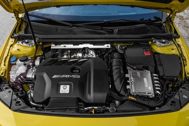Teszem hozzá: a motor most sem nagy. A kézzel készülő M139 jelű gép ugyanúgy soros négyhengeres és kétliteres, mint a 250 (224 Le) vagy AMG 35 (306 Le) változatokban. De nem ugyanaz, mint a Merci motor azokban, mert a AMG-nél alaposan áttervezték, megerősítették, sőt meg is fordították – most hátul van a kipufogó oldal a turbóval, és elöl a szívósor. Állítólag a töltés útja így rövidebb, cserébe a hűtés problémásabb, úgyhogy a kettős megfúvású turbóhoz nem csak az olajkör meg a vízkör látogat el, de menetszelet is vezettek rá. Hogy a kis köbcenti ellenére tisztességes legyen a teljesítmény, 2,1 barra növelték a turbónyomást, ami inkább kihegyezett tuning- és versenyautók világában megszokott, nem gyári, utcai gépeknél. Így tol ki egész tisztességes 387 lóerőt, legalábbis ennyit ír a katalógus az AMG 45 mellé, de Magyarországon azt nem árulják, csak a még tovább hegyezett, 45 S változatot, ami 421 lóerős. Négyszázhuszonegy.