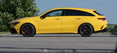 Hogy még cifrább legyen a sztori, az AMG 45 S 4Matic+ hajtásláncot nem ötajtós kompaktként, hanem csinos kombiként kaptuk. Magyarázhatják Stuttgartból napestig, hogy a CLA coupé az ebből épített puttonyos pedig Shooting Brake, azaz vadász kombi. Ez ugye egy olyan kupé lenne, amire kombi-fart fércelnek puskaszállításhoz, hogy az uraságoknak ne Land Roverben kelljen kizötykölődni az erdőbe, vadra lőni. De attól még nem lesz a kovács fiából úriember, hogy nemesi címet és kacagányt aggatnak rá, szóval a fronthajtásos A osztályból épített CLA Shooting Brake nálam egy sima kompakt kombi. Annak viszont csinos, és egész jó.