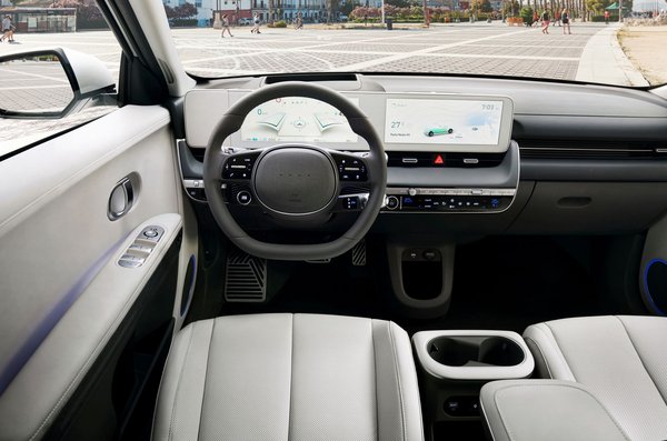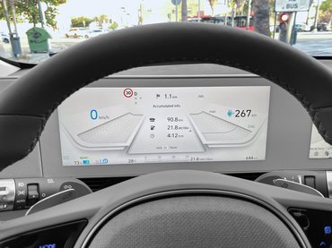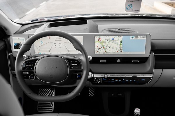 A Hyundai sajnos ugyanúgy összekötözte a cipőfűzőit a kezelőszervek és a digitális felületek tervezésekor, mint a legtöbb nagy autógyár. Minden elképzelhető menetkényelmi és biztonsági extra benne van, de a használata egészen kellemetlenül komplikált tud lenni. A két nagy képernyőn és a HUD-on óriási átfedésben ömlenek a redundáns információk. Három multifunkciós bajuszkapcsoló van, plusz két váltófül a regeneráció szintjét állítani, érintőgombok és billenőkapcsolók a kormányon, tucatszám gombok a kijelzők alatt és még extra érintőkijelző a klímakezeléshez.