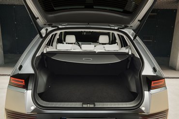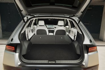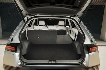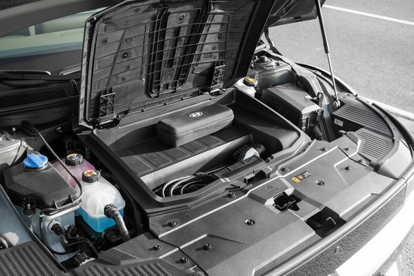 A csomagtartó 530 liter, és van egy jelképes, hátizsák méretű első csomi is, egy minden ízében motortérszerű üreg műanyag motorburkolatnak látszó második fedele alatt. Arra jó, hogy itt lakjon a töltőkábel és a kreszkészlet, de látszik, hogy nem volt szempont, hogy bárki tényleg használja. Több hely azért nincs, mert az első hajtás motor+inverter+elosztódoboz tornya olyan vaskos, és annyi cső, hőcserélő és radiátor tartozik a hőmenedzsment-rendszerhez, hogy elfogytak a köbcentik.