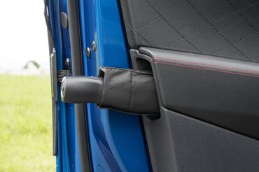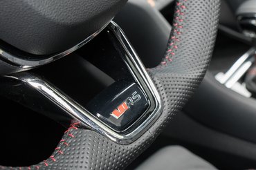 Lecsapott aljú sportkormányát perforált bőrbe kötötték és piros cérnával varrták meg, tényleg jó rámarkolni, tetszik rajta a két kis króm hordócska a gombok között. Komoly, gondosan megtervezett részletei vannak és ettől baromi hiteles. Nagy fadeszkányi felületen karbonminta üzeni, hogy ennél sportosabb egyszerűen nincsen és erre csak ráerősít a finom alcantara tetőkárpit, fekete színben, hogy ne zavarja a vezetőt a tükröződés. Ordítja a motorsportot a feszesre húzott, szénszál mintával dekorált kagylóülés, a fejtámlák alatt apró alagúttal, hogy könnyű legyen hatpontos öveket képzelni hozzá.
