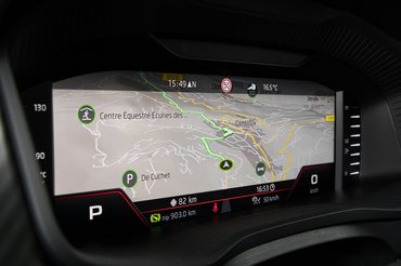 Sokféleképp konfigurálható digitális műszeregysége van, ami lehet hagyományos nézetű, sportosabb középre rendezett fordulatszámmérős - ennek van egy kis retrowave vonal a hátterében - és teljes képernyős navigációs is, kicsike számokkal a sarkában. Középen átlagos tablet méretű érintőképernyő, mellette taperolós gombokkal, benne végtelenül egyszerű menüvel és egy olyan navigációs szoftverrel, aminél egy ókori Mezopotámia térkép is nagyobb segítség. Amikor már sokadjára szívatott meg, akkor az Apple CarPlay-re rögvest nagy igény mutatkozott.