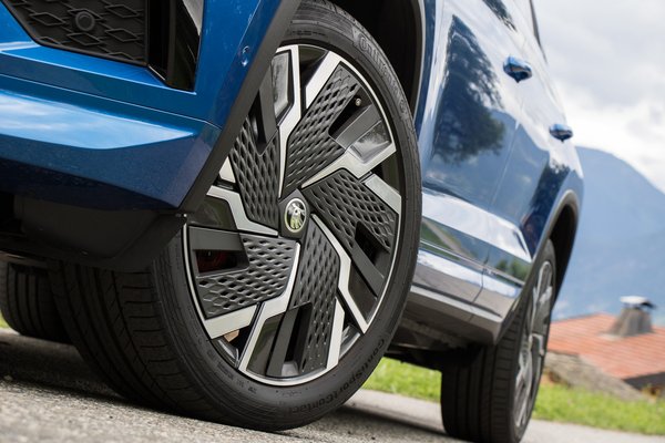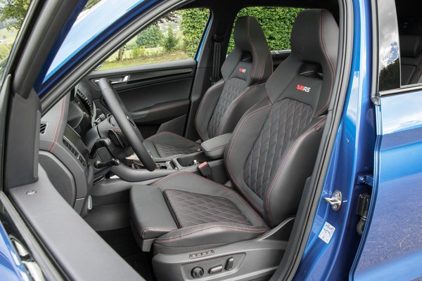 Bajuszosabban áll rajta az új hűtőmaszk, amiknek dupla lamellája alatt következetességet mellőzve gyémánt mintás légbeömlő, majd egy kis függőleges rácsozású rés van. LED-es fényszórói már mátrixoznak és új a nappali menetfények rajzolata is, az index pedig futófényesen villog. Alig látható a szépészeti beavatkozás a sima Kodiaq-okon, de az RS-en egész feltűnő, mert nem csak a lökhárítókat rajzolták át élesebbre, de a 20 colos alufelnikre is aerodinamikus betétek kerültek.