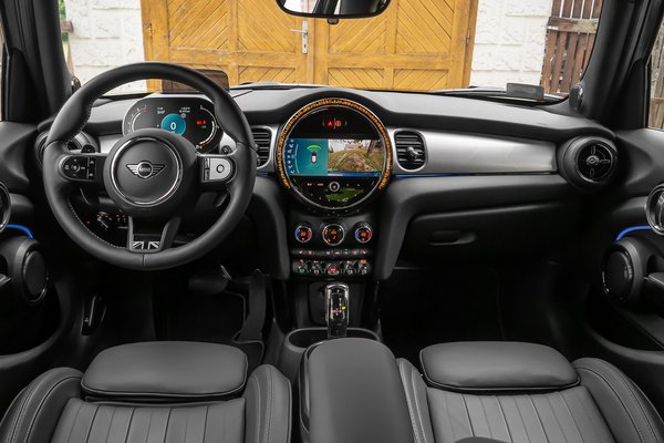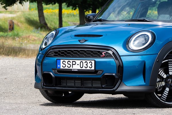 Aztán ezt az egészet még tovább tudják bolondítani az olyan sportos változatoknál, mint a Fiat 500 Abarth vagy ez a Mini Cooper S. Ez a forma kisebb-nagyobb frissítésekkel már elég régóta piacon van, de ahogy Cristiano Ronaldót sem hatja meg kétszer tizenöt perc hosszabbítás, úgy a Mini sem akar fáradni. A sima Cooperhez képest az S ábrázata annyiban más, hogy a lökhárító alsó részén, a maszk alatt kapott két jókora odút, az embléma fölé pedig egy beömlőt, amely inkább dekorációs célt szolgál. Jól néz ki a kerek lámpát körülölelő ledgyűrű, egyébként az irányjelző is így villog – maguk a lámpatestek pedig a géptetőből figyelnek kifelé, konkrétan ott vágtak nekik lyukat, nemcsak körbefuttatták őket.