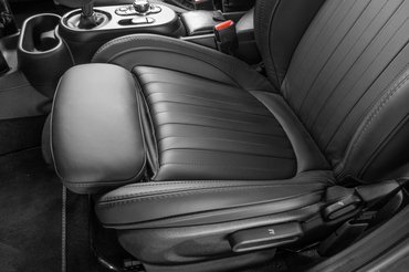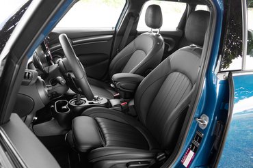 Ezen a Mini Yours felszereltségi szinten persze már mindenhol bőr vesz körül minket, stílusos a hosszanti bordás ülés is, amely amúgy minden irányba kézzel állítható, első belehuppanásra is nagyon kényelmes, de hosszabb távon sem volt rá panaszom, jól tart a kanyarokban is, van comb- és deréktámasza, meglepően kellemes volt benne ülni. Elöl. A hátsó sort már véletlenül sem dicsérném ennyire, na nem az ülések rosszak, csak egyszerűen a hely kevés. Bár fejtámla és biztonsági öv egyaránt három van, a pad ülőlapjának kialakításáról ordít, hogy soha nem gondolták komolyan, hogy ide hárman beüljenek. A lábtér amúgy normális, saját magam mögött is elvoltam, inkább a fejnek szűkös, de pluszpont, hogy a tarkóm mögött a plafon volt, nem az üveg.