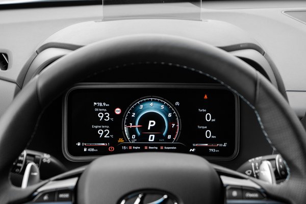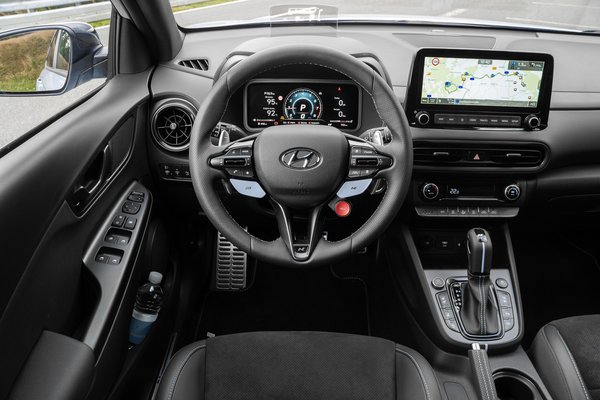 Odabent két egyformán 10,25 hüvelykes képernyő vár, melyeken indításkor a normál Hyundai órák és kijelzések jelennek meg, amit a többi frissített Konában, vagy épp a Tucsonban is láthatunk. Annyi csak a különbség, hogy fizikai gombok veszik körbe ezeket, nem érintő felületek, mint például az újabb fejlesztésű i20-ban. Eddig minden teljesen hétköznapi, a kormányon azonban van két N kapcsoló, és egy piros gomb NGS felirattal. A lapocskák az üzemmódváltók, a bal oldalival a sima programokat (Eco, Comfort, Sport), a jobbal pedig az N változat extra tudását aktiválhatjuk (N és Custom programok). Ugyanis ahogy ilyen autókban szokás, itt is több lépcsőben változtatható a motor harapóssága, a váltás karakterisztika, a kormány ellenállása, sőt, széria a három lépcsőben állítható futómű, ahogy a három állásos (On, Sport, Off) ESP is. És a kipufogó is egyre hangosabb lesz, ahogy lépkedünk egyre durvább programokba.
