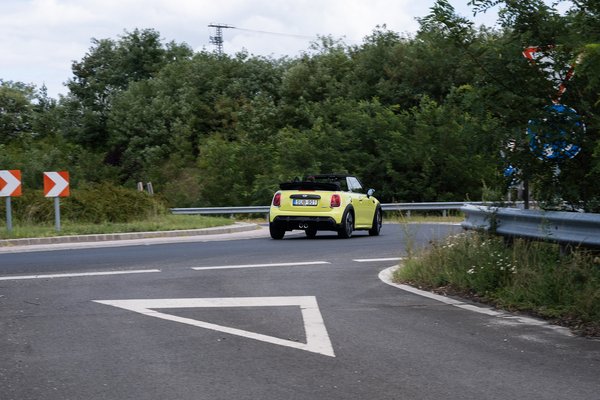 A hasonlat azért is ül, mert bár a show és a küzdelem elmarad, azért lassúsággal senki sem vádolhatja a JCW Cabriót, úgy felszalad a Pilisbe, hogy csak kapaszkodom benne, autópályán simán tolja a németes tempót, és az országúti előzésekben is nagy király. A tömeg előnye, hogy tapadása van elég, csak nagyon forszírozott helyzetben érzem alulkormányozottnak, és a feneke sem mocorog, szóval játékos gumilabda helyett inkább sínautó. Ez nagyjából pontot tesz a régi vita végére is, ide aztán tényleg teljesen felesleges a sperr, pláne, hogy mára annyit fejlődött az elektronika, hogy egy pillanatig sem érzem úgy, mintha a kezemre csapna, egyszerűen csak repülünk a cél felé. Igen, ez nem az a vadóc játszópajtás, amit a Minitől megszoktunk, de ezt itt el tudom engedni.