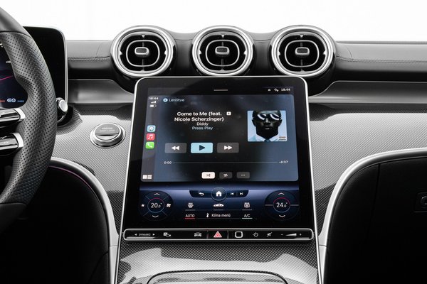 Hatalmas központi érintőképernyője enyhén a vezető felé fordul, így megvan az az érzés, amint E46-osban szeretek, hogy nekem szól az autó. Így a gigantikus tablet jobban kézre is esik, mint az S-osztályban. A kijelző alján mindig a klímapanel van, ezért azt valóban tudtam vakon kezelni már a második naptól, felette pedig ott az MBUX menüje vagy az Apple CarPlay (tudja vezeték nélkül, NFC-vel párosítja a telefont). Gyors, éles képű és logikus a rendszer, amiben tengernyi funkció könnyen elérhető és a Hey, Mercedes megszólítás után angolul fogadja a parancsokat, aztán állítja a hőmérsékletet, célt ad a navigációnak vagy viccet mesél, mert többet is tud.