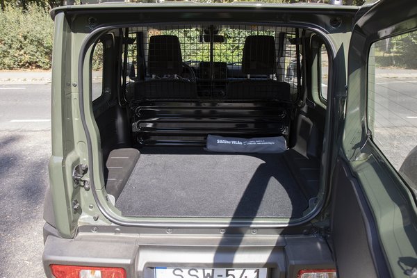 A kínálatba visszatérő Jimny újdonsága, hogy a korábban forgalmazotthoz képest kettővel kevesebb ülés van benne – kettő – , helyettük 863 liternyi egybefüggő csomagtér tátog a térelválasztó rács mögött. Szuper, hogy sík a padló, de Hlács kolléga jogosan fájlalta, hogy haszonjármű létére nincsenek rögzítószemek és a hátsó ablakok sem sötétítettek. Mivel a hátsó utasok eleve a hátsó tengely kramancai és a negyven literes tank fölött ültek, nagy tartalékokat nem rejtegetett a civil Jimny, a kétüléses 33 literrel nyújt többet nála, nyilván lehajtott ülésekkel. Köbméterre tehát egész jól kiadja, de igazi munkagépnek ez a szűk alapterület és a röhejes, 150 kilós hasznos terhelhetőség miatt kevés.